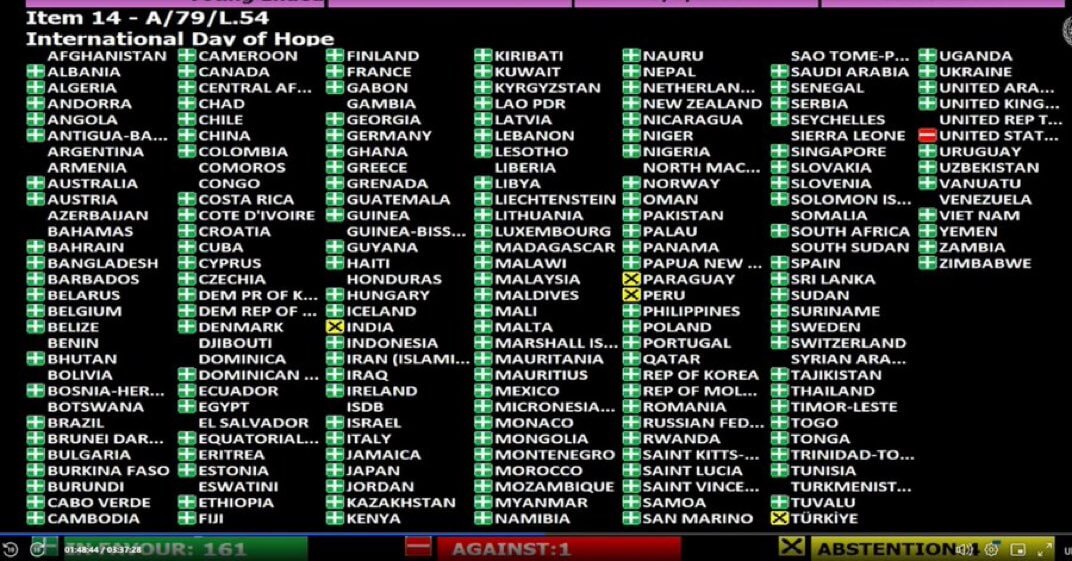 Die USA haben als einziges Land in den Vereinten Nationen gegen die UN-Resolution A/79/L.54 gestimmt, die einen „Internationalen Tag der Hoffnung“ vorschlägt.